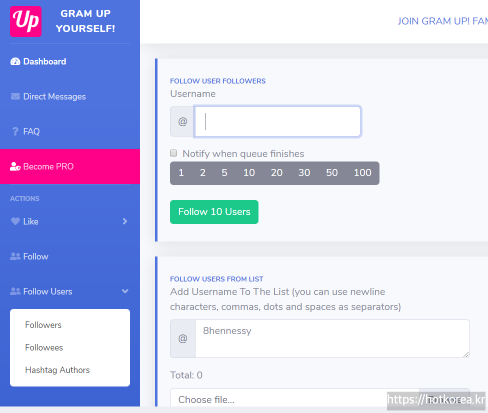 유저 네임에 팔로우를 원하는 계정을 선택하면, 해당 계정의 팔로우들을 자동으로 팔로잉해줍니다.