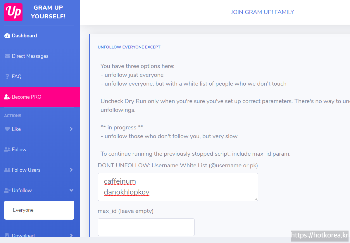 오른쪽 하단에 DONT UNFOLLOW에 유저네임(계정)을 입력하면 해당 계정을 제외하고 모두 언팔을 자동으로 처리해줍니다.