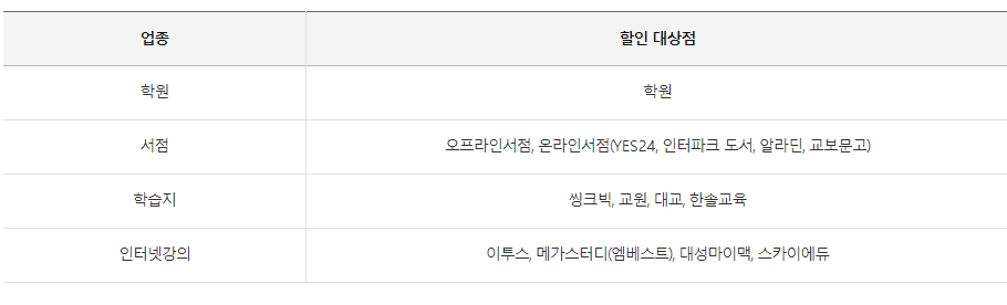 학원,서점,학습지,인터넷강의 5%할인은 어디까지 혜택이 될까요?