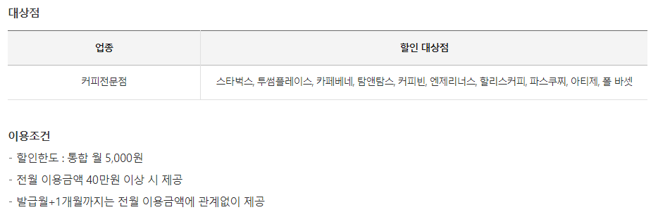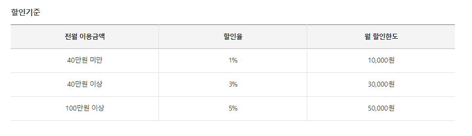 아래와 같고, 40만원 이상전월실적이면 5,000원할인한도 100만원 이상이면 10,000원할인한도가 적용됩니다.