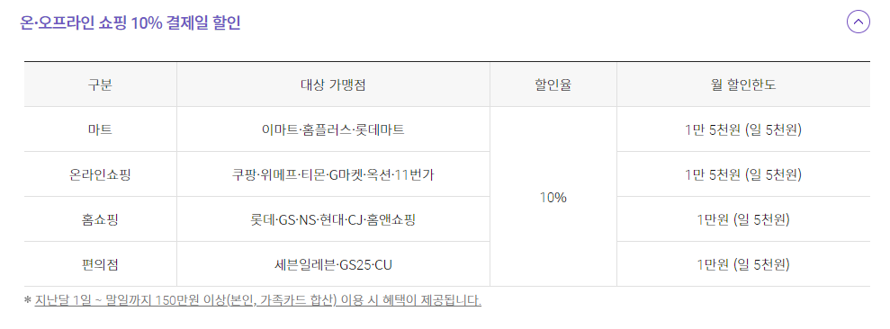 - 할인 혜택은 아래와 같습니다. 마트 10%, 온라인쇼핑 10%, 홈쇼핑 10%, 편의점 10%입니다.