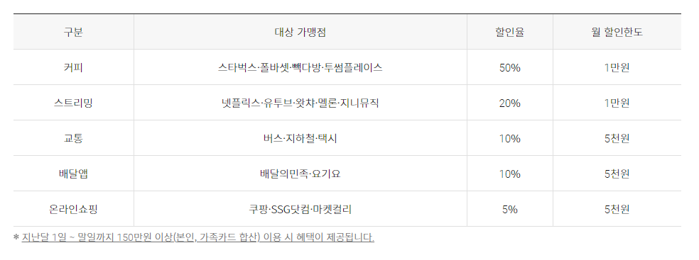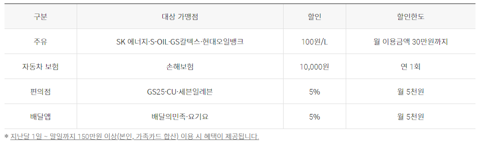 - 단 조건이 전월실적 150만원 이상이어야 합니다. (가족카드 합산도 됩니다.)