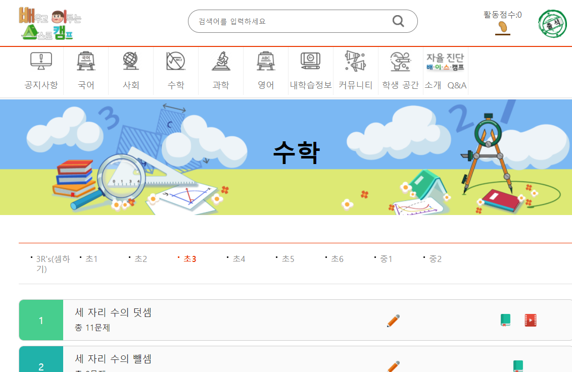 초3 시간의 덧셈과 뺄셈 목록에 있는 동영상을 클릭해보면 아래와 같이 학습할 수 있습니다.