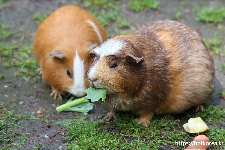 기니피그는 초식동물입니다. 그래서 일반적으로 건초, 그리고 야채, 고형사료(pellet 또는 펠렛)를 주면 됩니다.
