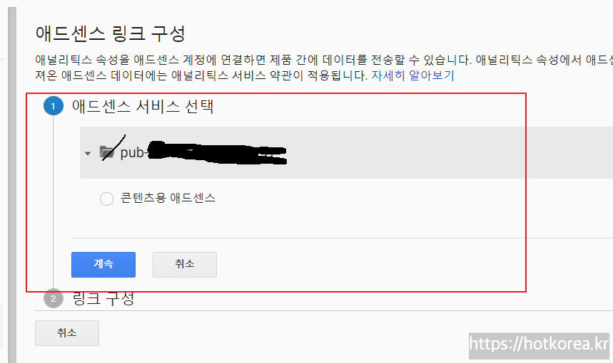 3. 에드센스 링크 구성에서 에드센스 서비스 선택.