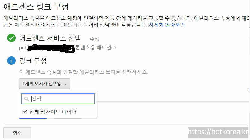 - 링크구성에서 아래화면 1개의 보기가 선택됨에서 전체 웹사이트 데이터를 선택해줍니다.