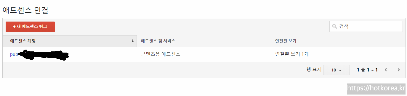 6. 정상적으로 되었다면 아래와 같은 에드센스 연결에 연결된 계정이 뜹니다.