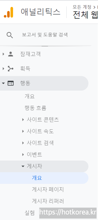 2. 왼쪽메뉴에서 행동- 게시자 - 개요 클릭.