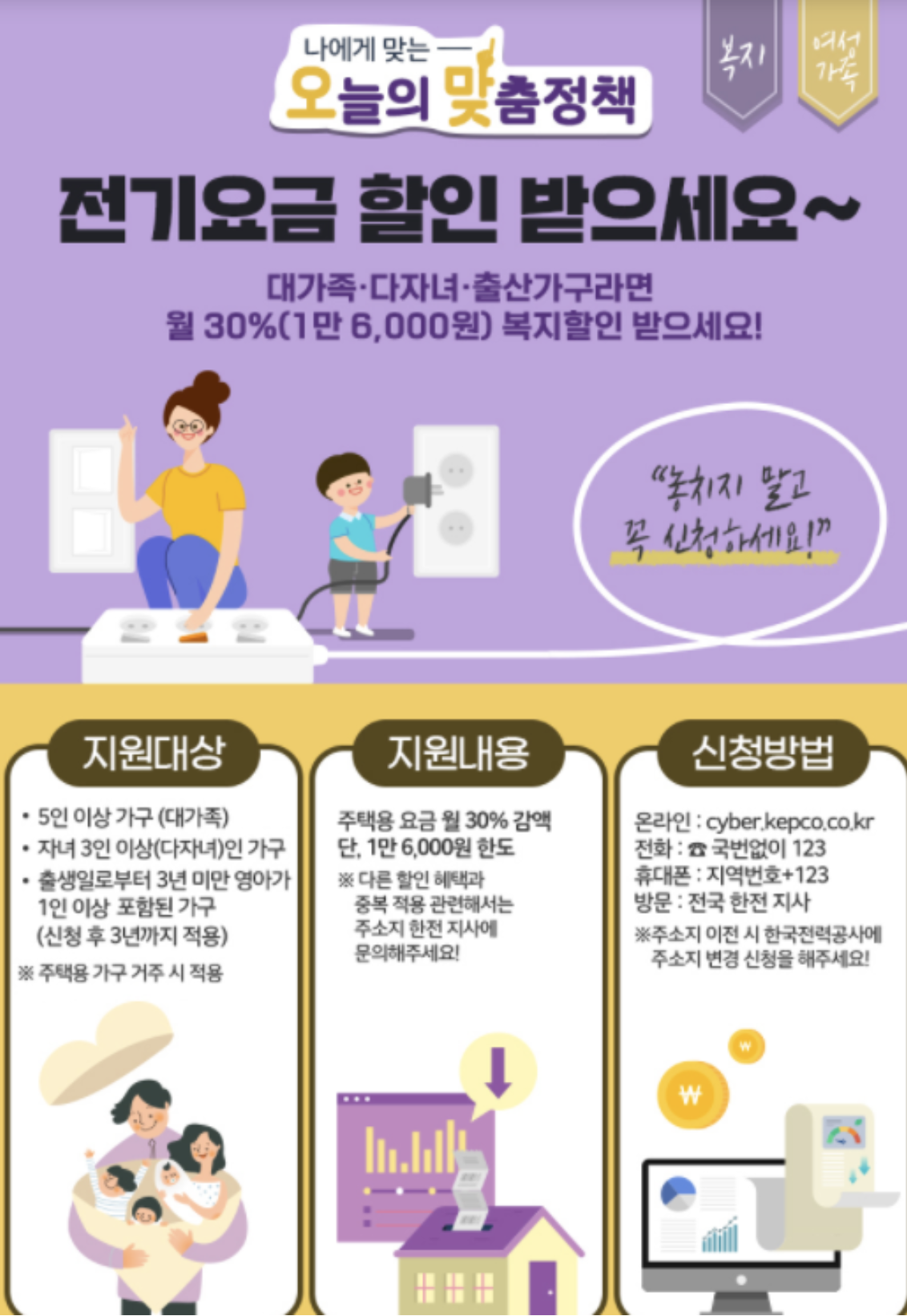 - 주거용 주택용 고객이며, 주민등록표상 가구원수 5인 이상이거나, 가구원중 자녀가 3인 이상인 가구(세대별 주민등록표상 세대주와의 관계가 "자(子)" 3인 이상 또는 "손(孫)" 3인 이상으로 표시된 가구)이거나 출산·입양 등으로 세대별 주민등록표 상 출생일로부터 3년 미만인 영아가 1인 이상 포함된 가구 이어야 합니다.