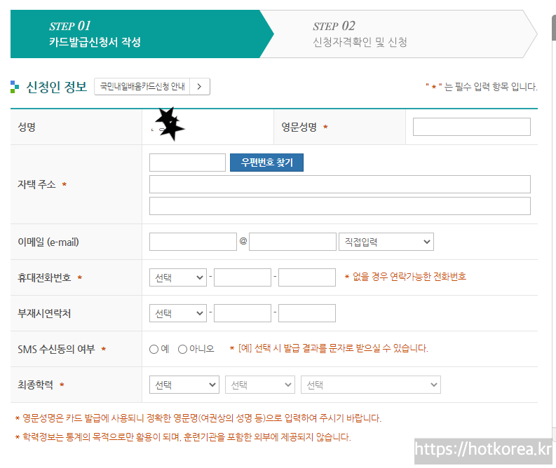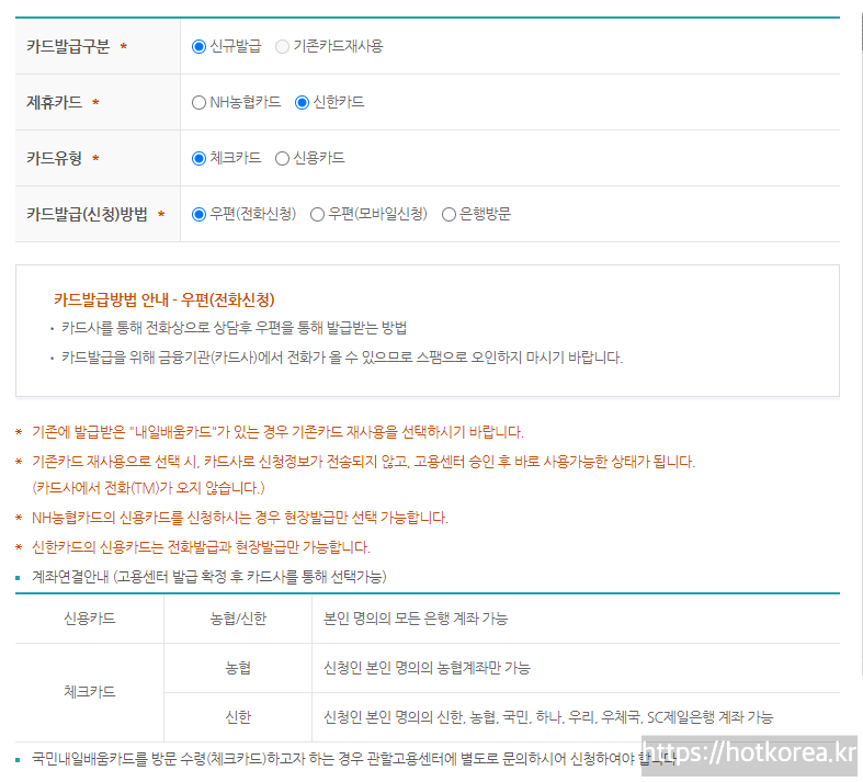 신청서 작성시 카드발급관련하여 유의사항이 있습니다.