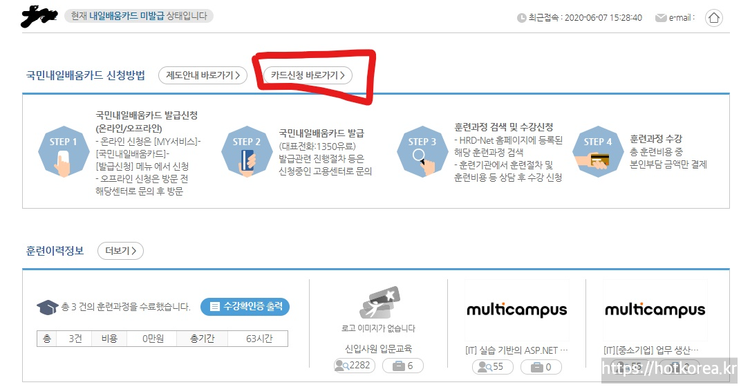 신청하지 않았다면, 내일배움카드 미발급상태입니다. 와 같은 메세지가 뜨는군요.
