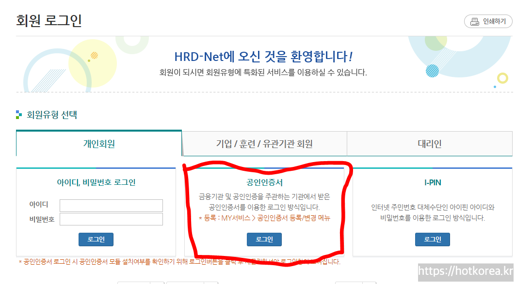 가지고 계신 공인인증서도 HRD-NET에 등록해야 합니다.