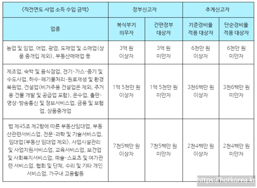 복식부기의무자, 간편장부대상자, 기준경비율적용대상자, 단순경비율적용대사자에 대한 구분이 나옵니다.