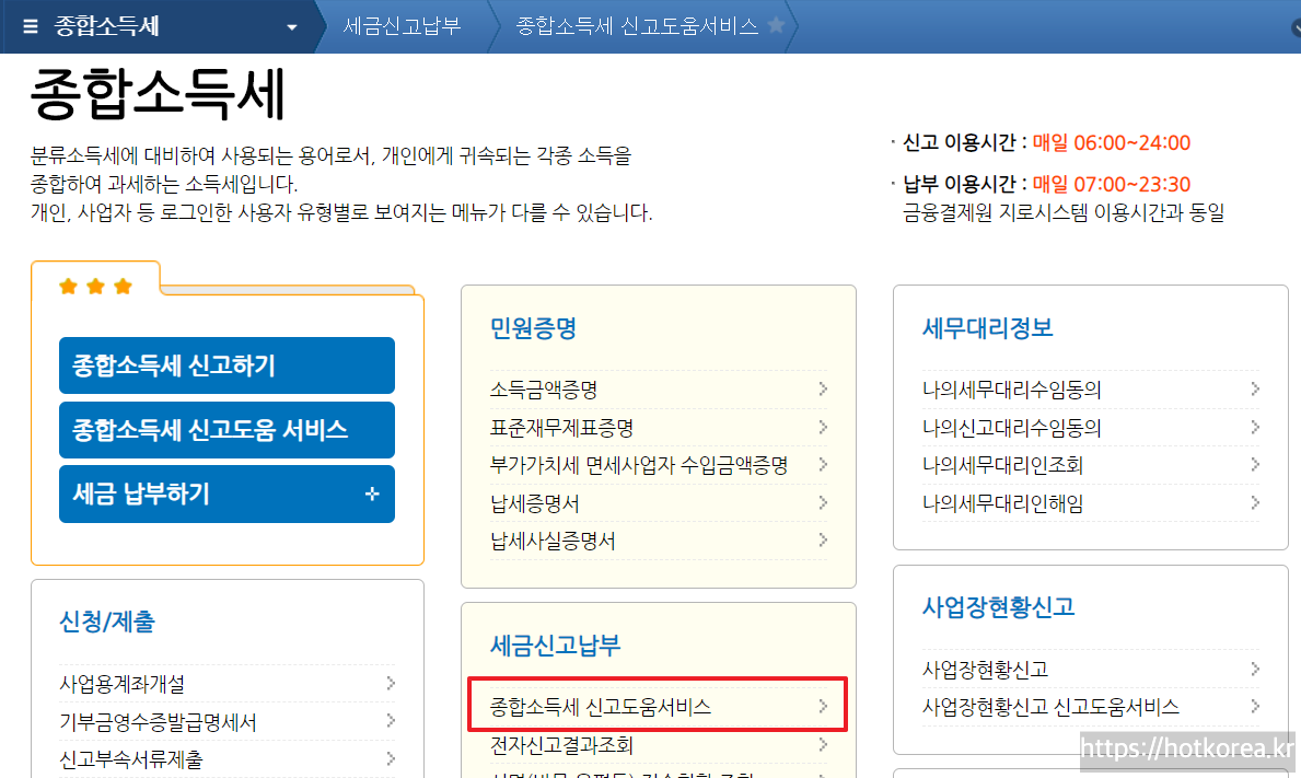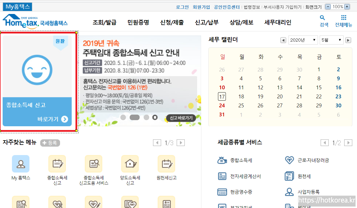 2.메인화면에 제일 왼쪽, 종합소득세신고 바로가기 클릭