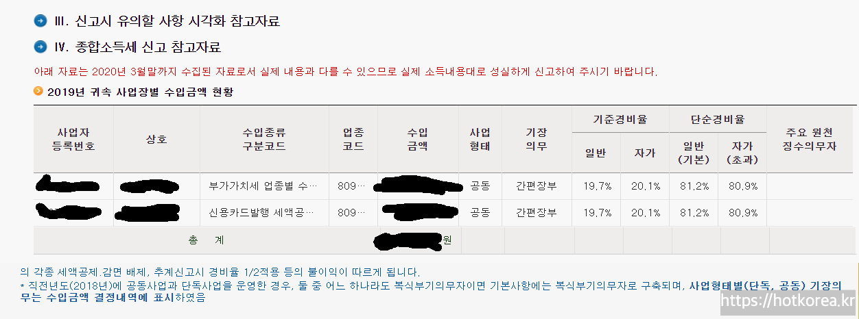 로그인 이후에 본인의 사업자 유형 및 얼마의 매출이 국세청에 신고되었는지가 조회가 가능합니다.