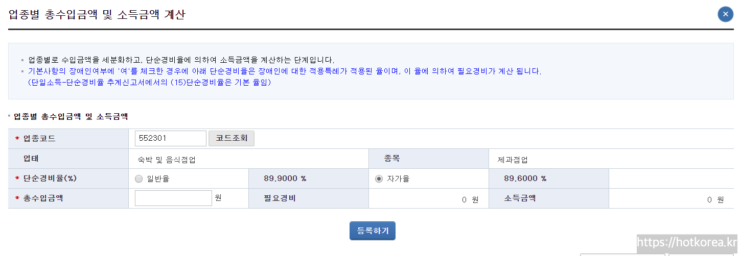7. 업종별 총수입금액을 조금전에 검색해서 확인한 내용으로 입력합니다.