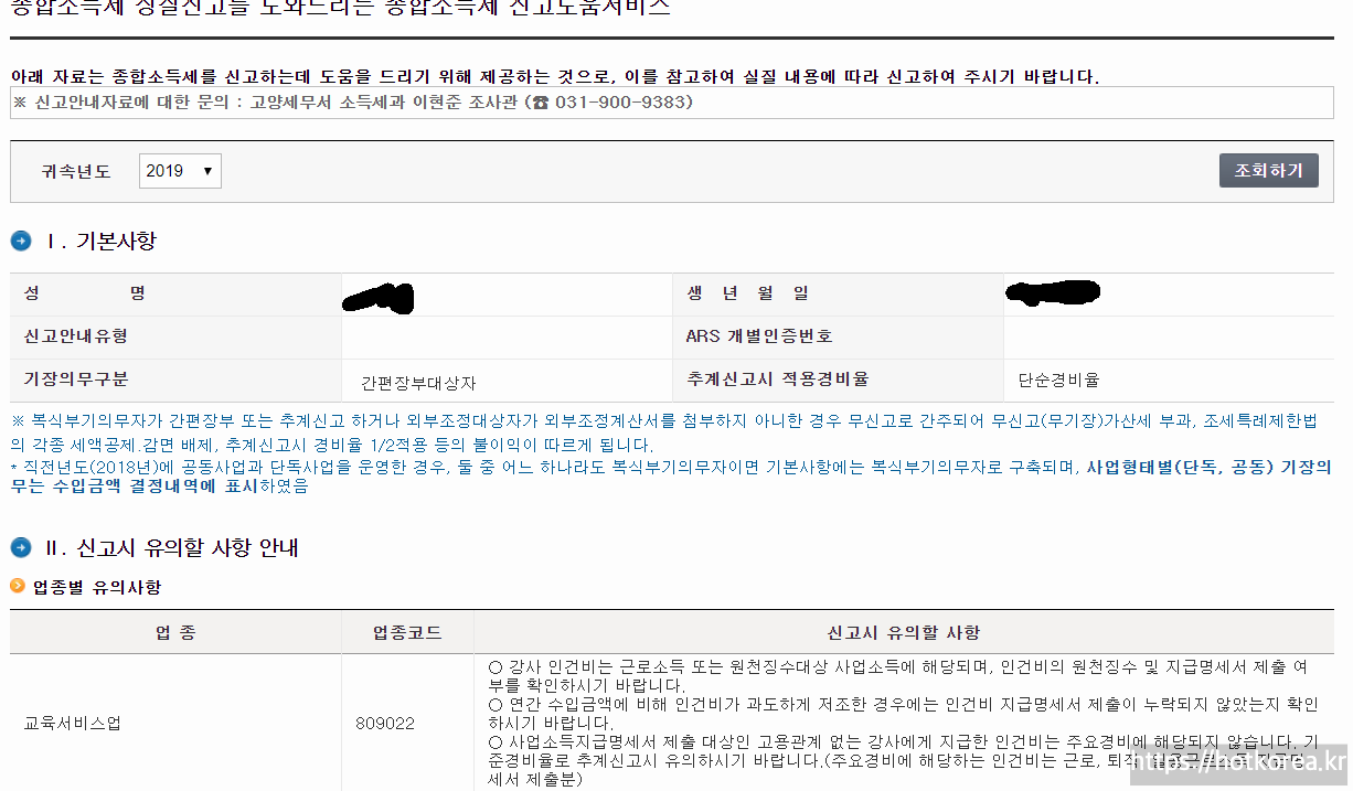 종합소득세 메뉴에서 아래에 종합소득세 신고도움서비스를 선택하시면 본인의 사업자 및 어떤 신고를 해야하며 매출이 얼마인지 상세하게 나옵니다.